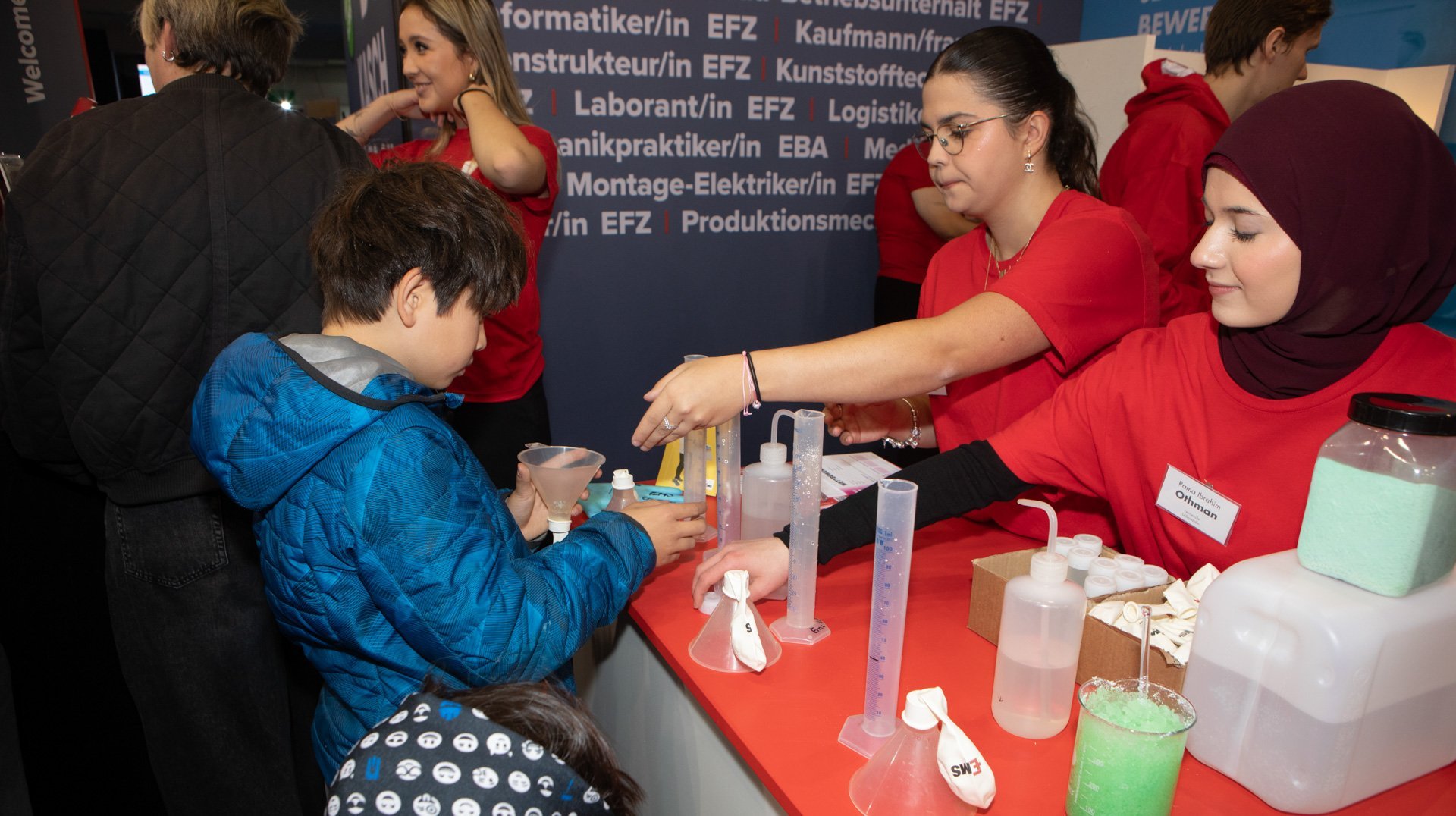 Jedes zweite Jahr findet die FIUTSCHER statt. An unserem Stand zeigen wir jeweils unsere verschiedenen Lehrberufe. Von Chemieexperimenten durchführen bis zu LED-Männchen löten kann man die unterschiedlichen Arbeiten selber ausprobieren.